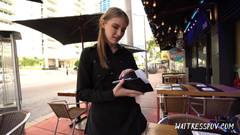 A garçonete aceita a proposta de foder por algum dinheiro.