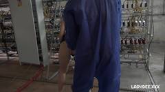 Uma garota asiática gostosa quer foder com um empregado da fábrica.