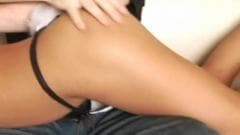 A coelhinha está adorando levar uma surra. Ela está deitada de bunda pra cima no colo do cara. Ele puxa a calcinha dela, revelando sua bucetinha da morena!