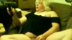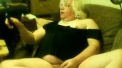 Esta vagabunda gorda acaricia seus seios enquanto ela masturba seu pequeno pau. Ela acaba esguichando e engolindo seu próprio esperma.