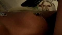 Em lingerie sexy, a asiática se exibe e começa a se despir. Ela mostra os seios grandes com piercings, depois passa um dildo na boca e coloca no cuzinho!