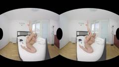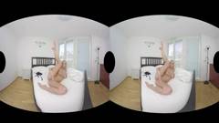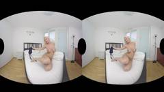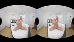Deusa loira em lingerie sexy movendo os quadris sensualmente e tocando e provocando sua buceta enquanto você pode vê-la em realidade virtual.