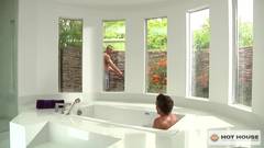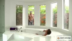 Um homem bonito e musculoso espia pela janela um cara sexy e bonito se masturbando na banheira.