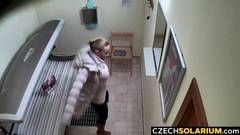 Essa loira sexy não sabe que está sendo filmada pela câmera de segurança enquanto tira toda a roupa e se bronzeia no solário.