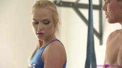 Esta estrela pornô loira bonita começa a foder com o seu treinador. Ela continua a fazer desporto ao mesmo tempo para acabar em grande