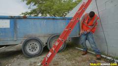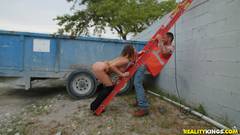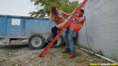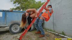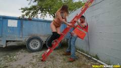 Ela Reese já transou com todos os trabalhadores da construção civil. Esse homem tatuado transa com ela em uma escada e em uma plataforma.