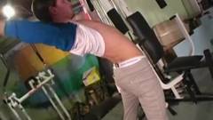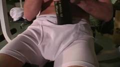 O jovem Spike terminou seus exercícios e está muito animado. Ele acaricia todo o corpo e brinca com um taco de beisebol.