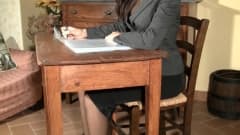 A morena usa meias pretas finas e sapatos de salto. Ela tira os sapatos, começa a mexer os dedinhos, e põe os pés sobre a mesa. Que delícia de fetiche!