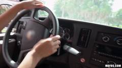 Na parte de trás da van, as duas estrelas pornô Quinn Wilde e Sophia Leone exibem seus seios. Elas se divertem e até tiram a calcinha.
