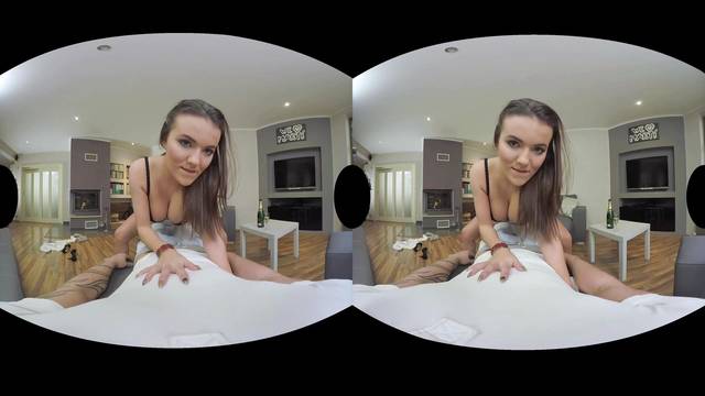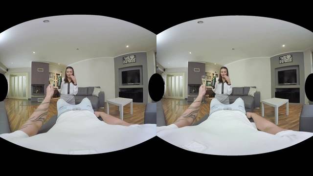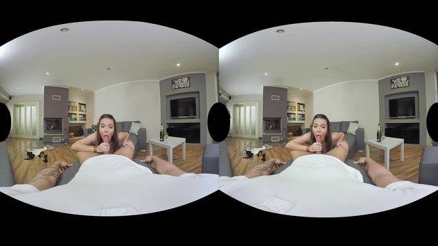 Feliz com a promoção, a mulher traz champanhe. Depois de beber, ela provoca o homem e abaixa sua calça para lhe fazer um boquete.