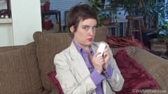 Ela se acomoda no sofá e se prepara para se masturbar usando um vibrador na buceta peluda, que fica bem gostoso quando ela abre as pernas