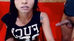 Essa trans chupa o pau do cara enquanto interage com os fãs. Ele vai oferecer porra na cara dela e ela gosta, mas quando é urina ela fica enojada!