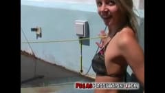 O casal aventureiro se esconde atrás do escorrega e fode ao estilo doggystyle no parque aquático. Ele ejacula sobre o rabo dela antes de pular.