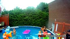 As duas vadias começam a fazer sexo oral em todos os caras na piscina. Outros são fodidos e gozam em cima delas, há até esguicho!