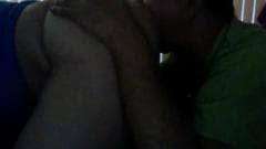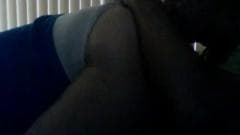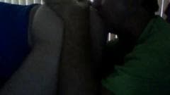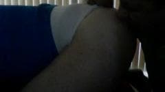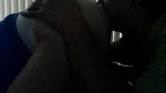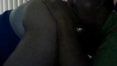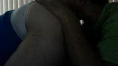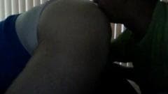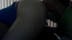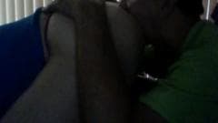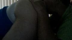O cara começa mordendo a bunda da namorada por cima da roupa, e depois passa para um beijo grego. Ele dá palmadas.Ela faz twerk e ganha mais chupadas no cu