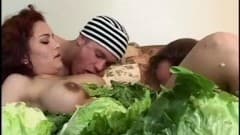 Dois anões sãem da prisão e pagam uma visita a esta Milf com o sexo em suas mentes. Ela está na cozinha e os legumes vão ser o seu colchão.