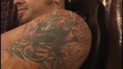 Depois de um show, um roqueiro musculoso e tatuado fuma enquanto se masturba e ejacula para nós.