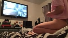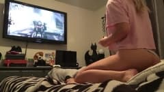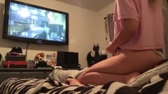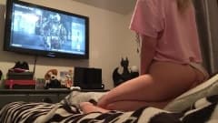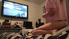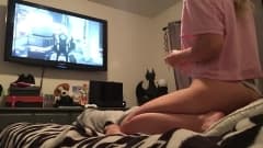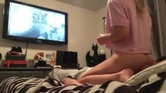 Uma jovem loira excitada senta-se no rosto de seu homem e, sem parar para jogar um jogo de computador, é picada como uma prostituta profissional!