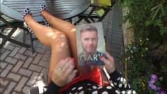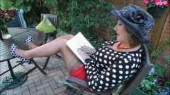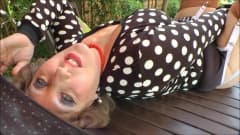 A mulher idosa brinca com seus brinquedos sexuais no jardim.