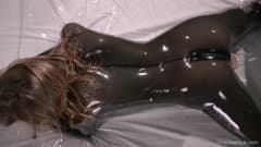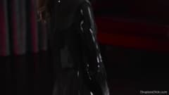 Ela gosta de fingir que tem uma pila, então comprou uma roupa de látex com um dildo colado nela para bater uma punheta até gozar.
