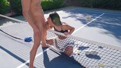 Novinha safada cheia de tatuagem estava chia de tesão quando acordou e aproveitou do seu treinador de tenis para uma foda gostosa