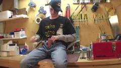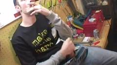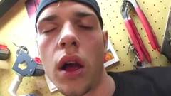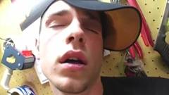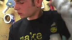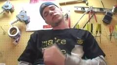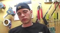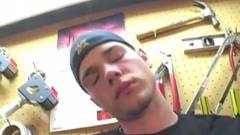 Esse faz-tudo está em sua garagem, tira o pênis da calça jeans folgada e começa a se masturbar sensualmente.