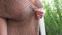 Incrível Kelly Madison com suas enormes mamas sendo fodidas do lado de fora no chuveiro numa posição de cão de pé.
