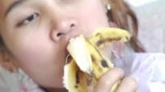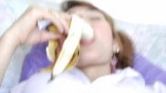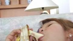 Uma jovem transexual bonita comendo uma banana enquanto ela se masturba. Um cara coloca um dildo no seu traseiro.