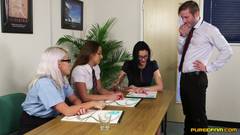Esse cara participa de uma entrevista de emprego na qual os recrutadores são três prostitutas muito sexy e ousadas que acabam chupando seu pau.