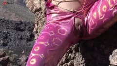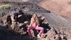 Garota loira se masturba sozinha atrás das pedras com um vibrador