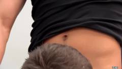 Dois caras estão no banheiro e um deles abre o zíper da calça jeans e tira o pênis para o outro começar a chupá-lo!