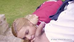 Novinha loira sexy pagando um boquete fora da escola ao ar livre para o professor velho pervertido não deixar ela de recuperação.