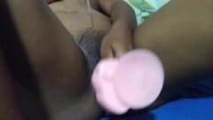 A garota negra cabeluda se masturba com seus dildos antes de foder
