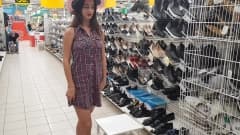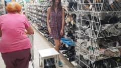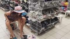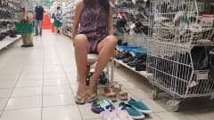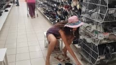 Essa vagabunda de saia não está usando calcinha. Ela vai experimentar sapatos diferentes, e mostra sua buceta peluda para nossa alegria