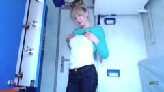 Essa loira bonita está em um trem a caminho de casa, ela fica com tesão e decide se masturbar ali mesmo com seu vibrador e gravá-lo com sua câmera.