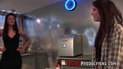 Lily Douce e Niki Crimson estão na cozinha, estão se beijando e a sogra está cuidando da garota, cuspindo em sua buceta para dilatá-la.