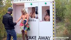 A loira escolhida na máquina de pegue e foda começa a chupar o pau do cara imediatamente. Ele vai lamber e meter seu pau grosso a bocetinha da loira!