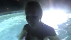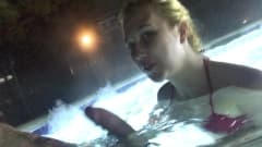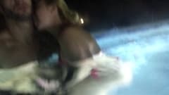 Ambos terminam numa jacuzzi durante a noite e a safadona lhe dá uma punheta e um broche ao amante