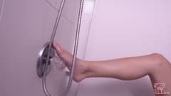 Ela teve uma boa sessão de yoga mas não conseguiu evitar bater uma siririca no chuveiro quando ficou excitada e começou a se masturbar.