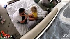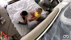Essa linda loira está intensamente excitada e masturba sua buceta com um vibrador até o orgasmo, além de chupar o pau de seu meio-irmão!