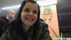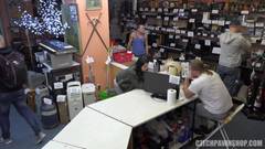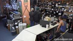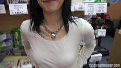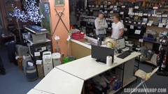 O cara oferece dinheiro em troca de sexo. Ela aceita e vai para o fundo da loja com ele. Ele apalpa seus peitinhos, pede um boquete e fode sobre o balcão