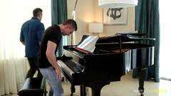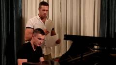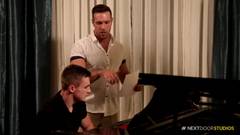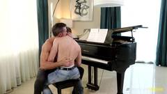 O jovem músico só pensa no galo do professor bonito que o fará relaxar quando comer ele no piano.