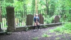 Para essa loira não há lugar certo pra ter prazer. Ela baixa as calças e se masturba com siririca em frente a um cemitério e um hospital psiquiátrico!
