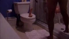 Essa mulher é satisfeita no banheiro pelo marido, que quer que ela molhe o creme antes de punhetar seu pênis e sentir seu esperma.