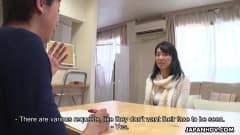Essa mulher asiática assiste a uma entrevista na qual ela acaba com as pernas bem abertas, mostrando sua bichana peluda e fodendo com seu entrevistador.