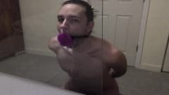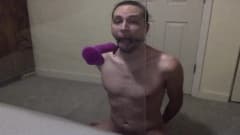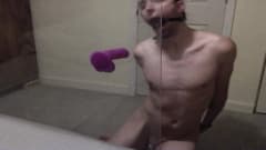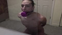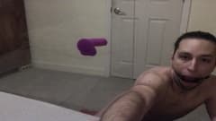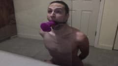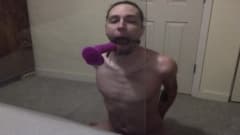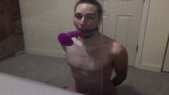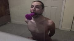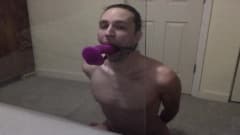 Jovem gay pratica garganta profunda em brinquedo sexual