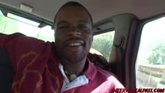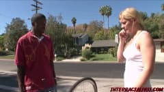Um homem negro ajuda a bela loira Madison com sua bicicleta. Em agradecimento, ela lhe dá sua buceta.