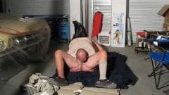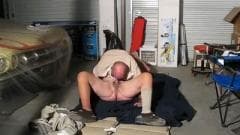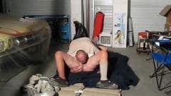 Dois velhos Gays Amateurs dão muito prazer um ao outro no chão da garagem sugando os seus pequenos galos e fazendo um 69