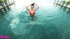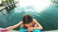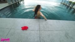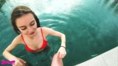 Uma linda garota dá um mergulho na piscina e depois, toda molhada, faz um boquete espetacular para o seu homem.