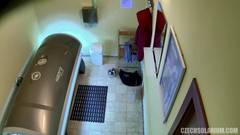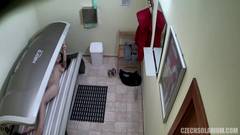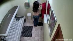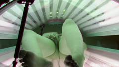 Ela toca seu clitóris na cabine de solário